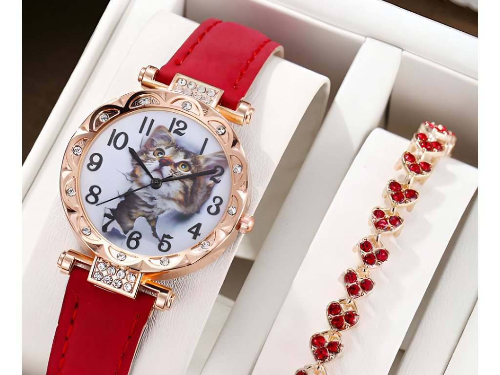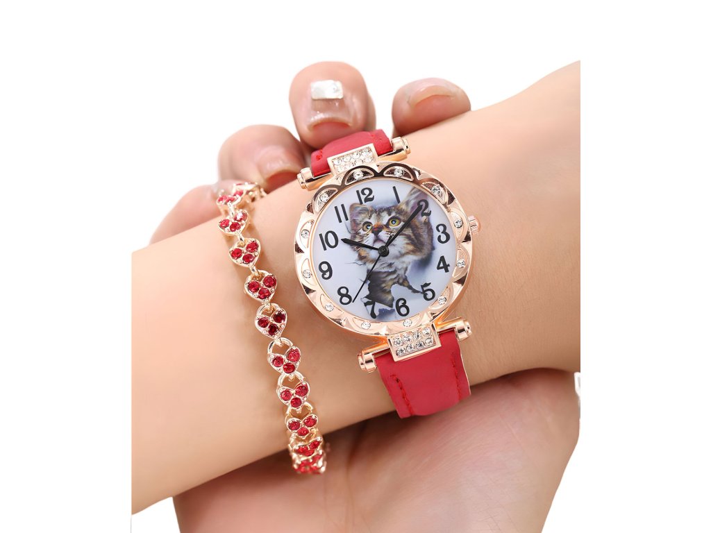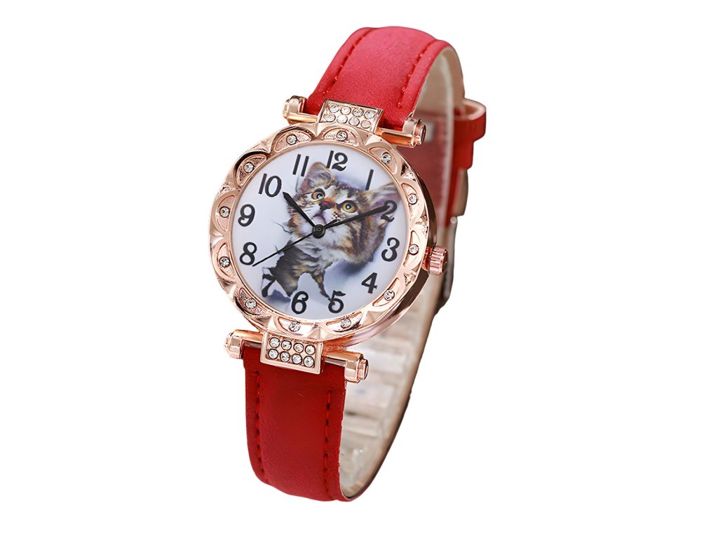 Stylové ručičkové hodinky s roztomilým motivem kočky potěší každou malou parádnici! Hodinky mají přehledný ciferník s jasně čitelnými číslicemi, takže jsou ideální i pro děti, které se teprve učí poznávat čas. Součástí balení je také ladící ozdobný náramek s kamínky ve tvaru srdíček, který krásně doplní celý outfit.