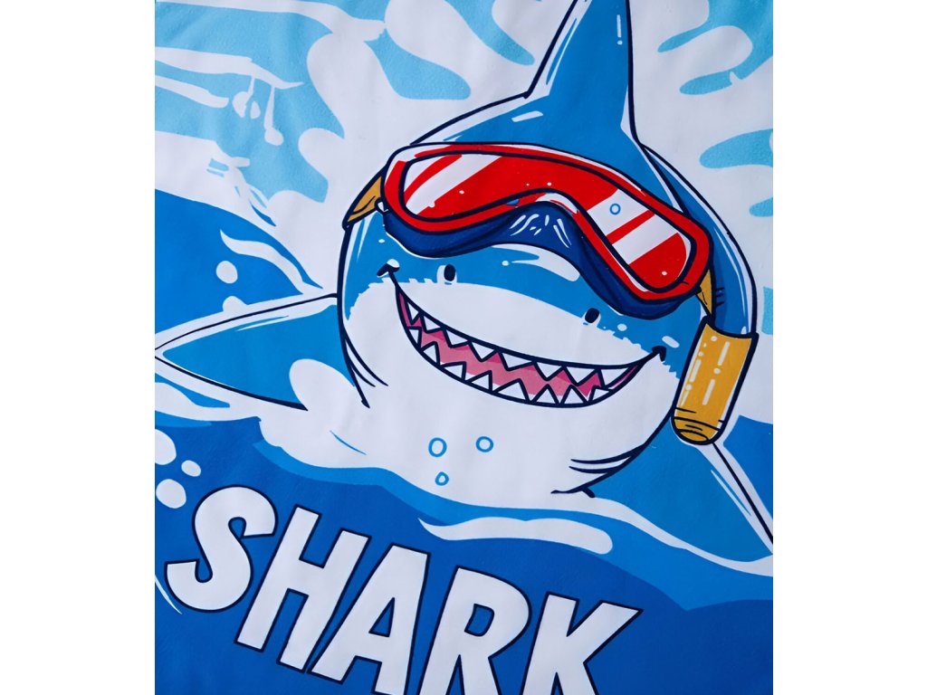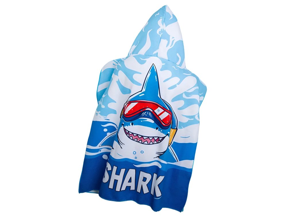 Originální dětské pončo v sytých barvách, s kapucí, s motivem žraloka je příjemně jemné a vhodné k vodě na osušení, ale i jako ochrana před sluncem. Díky použitému materiálu je pončo lehké, savé a velmi rychle uschne. Ideální na pláž, k bazénu i na letní dovolenou. Praktický střih dětem umožní volný pohyb a snadné oblékání.