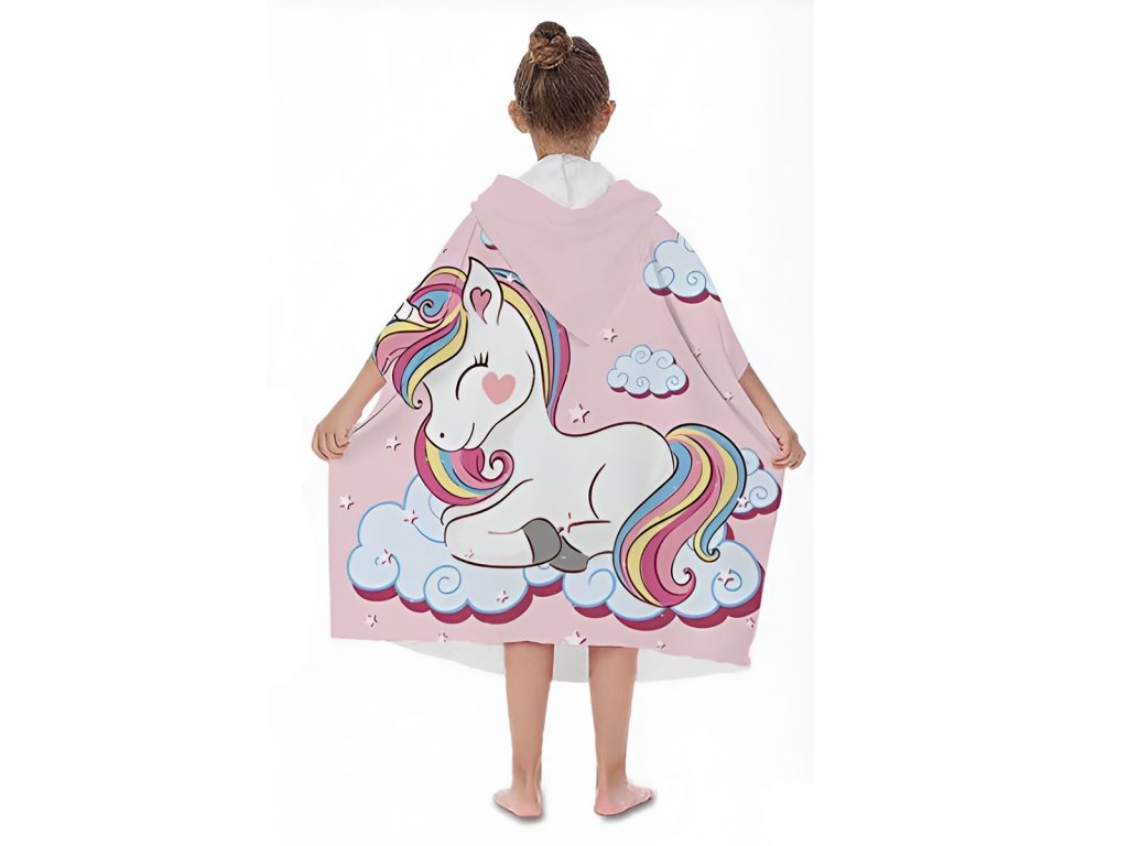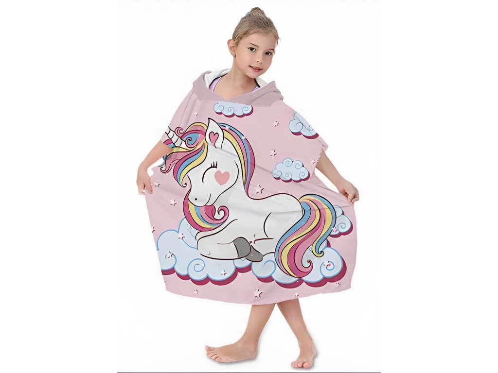 Krásné dětské pončo v sytých barvách, s kapucí, s motivem oblíbeného jednorožce je příjemně jemné a vhodné k vodě na osušení, ale i jako ochrana před sluncem.