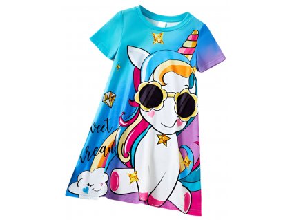 Slušivé dívčí šatičky s oblíbeným motivem jednorožce. Vhodné pro každodenní nošení. Pohodlný volný střih, dlouhý rukáv.