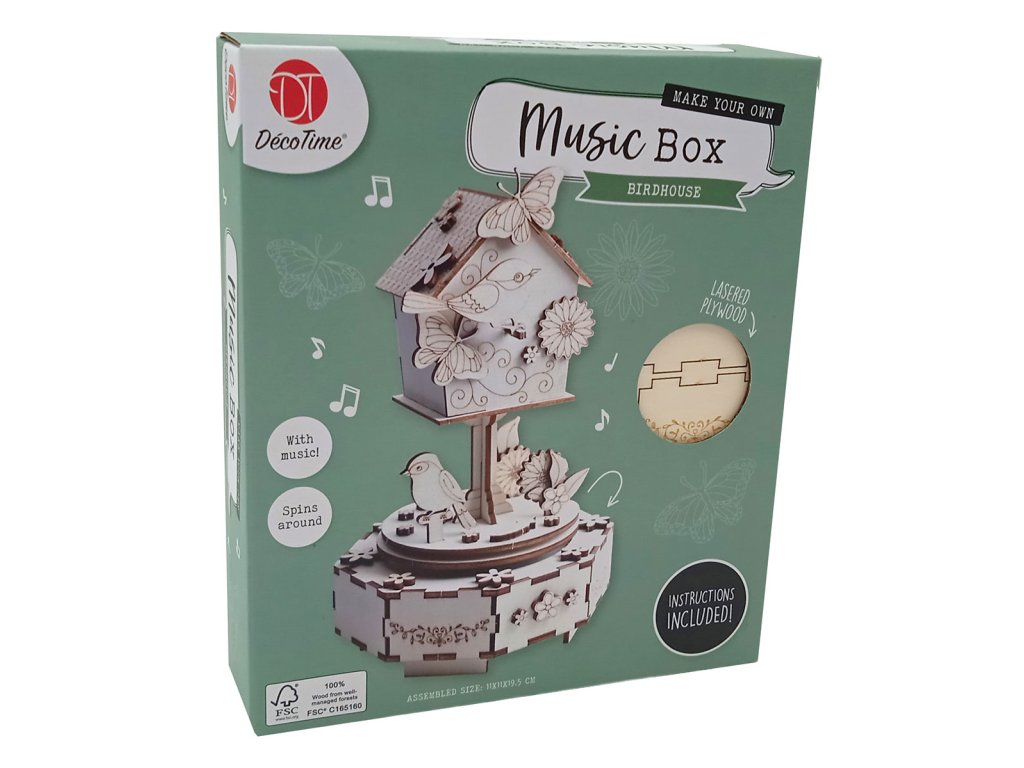 Vytvořte si vlastní 3D fungující hrací skříňku z ekologického dřeva s certifikací FSC®. Tato otáčecí skříňka po sestavení přehrává příjemnou melodii a stane se nejen krásnou dekorací, ale i originálním dárkem. Kreativní sada potěší děti i dospělé, podporuje jemnou motoriku, trpělivost a radost z tvoření. Tyto 3D puzzle jsou velmi rozšířené a oblíbené u starších dětí i dospělých.