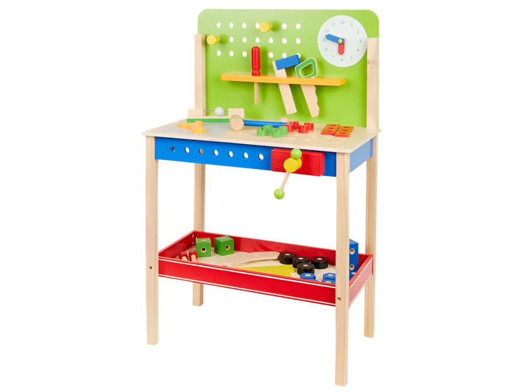 Umožněte vašim malým řemeslníkům objevit radost z tvorby s naším dřevěným kutilským stolečkem, který přináší do jejich světa kouzlo tvorby a kreativity. Tento kvalitní stůl je navržen tak, aby poskytoval stabilní a bezpečné prostředí pro různé kutilské projekty. Zakulacené hrany zajišťují bezpečné používání a hraní. S dodatečnými nástroji jako kladivo, šroubovák, stavebnicové kostky, desky, šroubky a matice, se vaši malí kutilové stanou opravdovými řemeslníky. Stoleček má úložný prostor pro ukládání nástrojů, materiálů a všeho potřebného pro dětské kutilství.