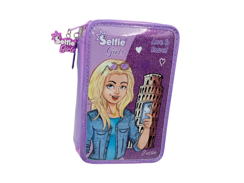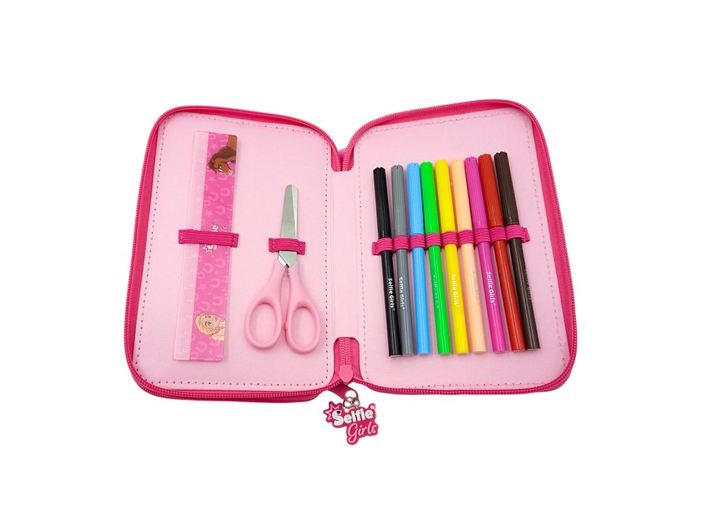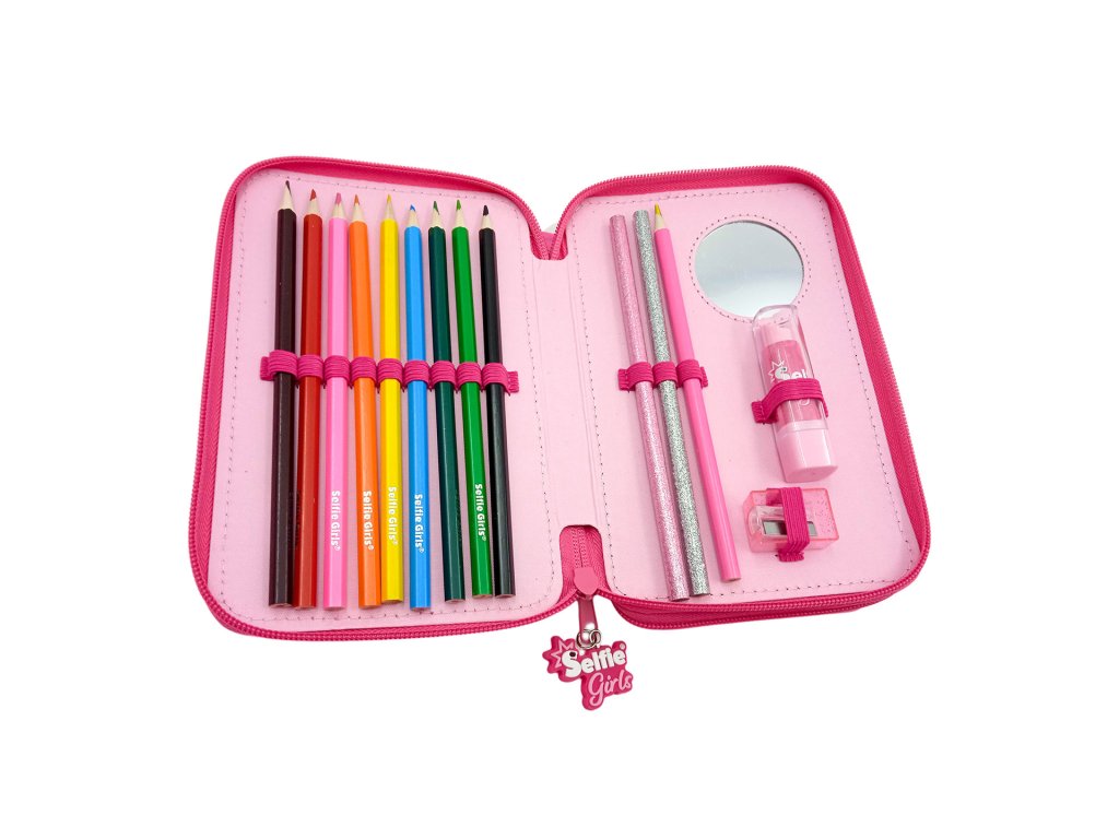 Třpytivý školní penál Selfie Girls jistě potěší každou malou školačku. Penál má dvě patra a obsahuje fixy, pastelky, tužky, gumu, pravítko, ořezávátko, nůžky a malé zrcátko.