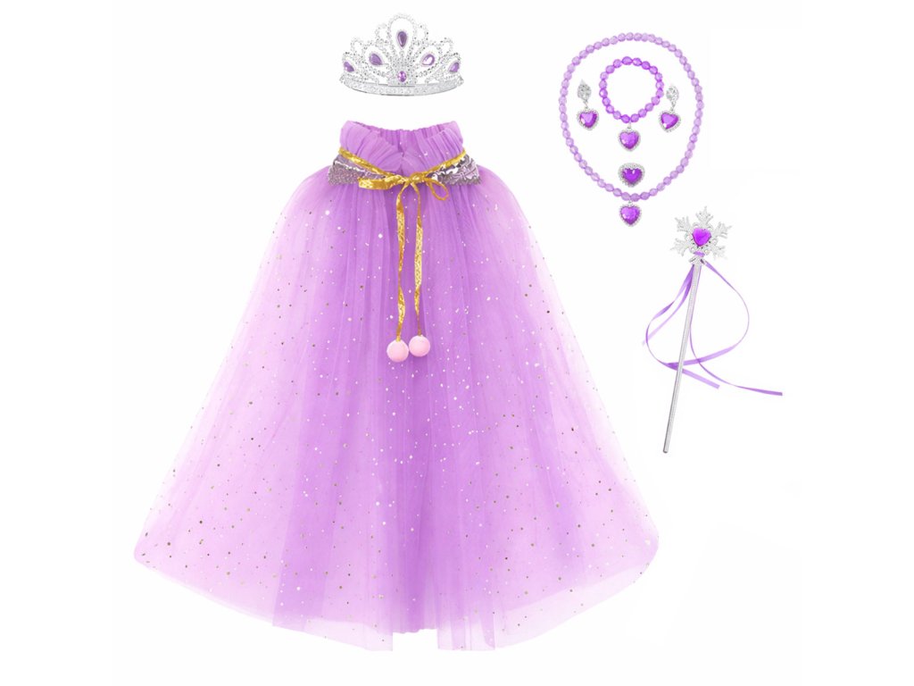 Fialový tylový plášť s malými třpytivými hvězdami přenese Vaše děti do pohádkového světa. Součástí pláště je také kouzelnická/princeznovská hůlka, korunka, náhrdelník, náušnice a prsten.