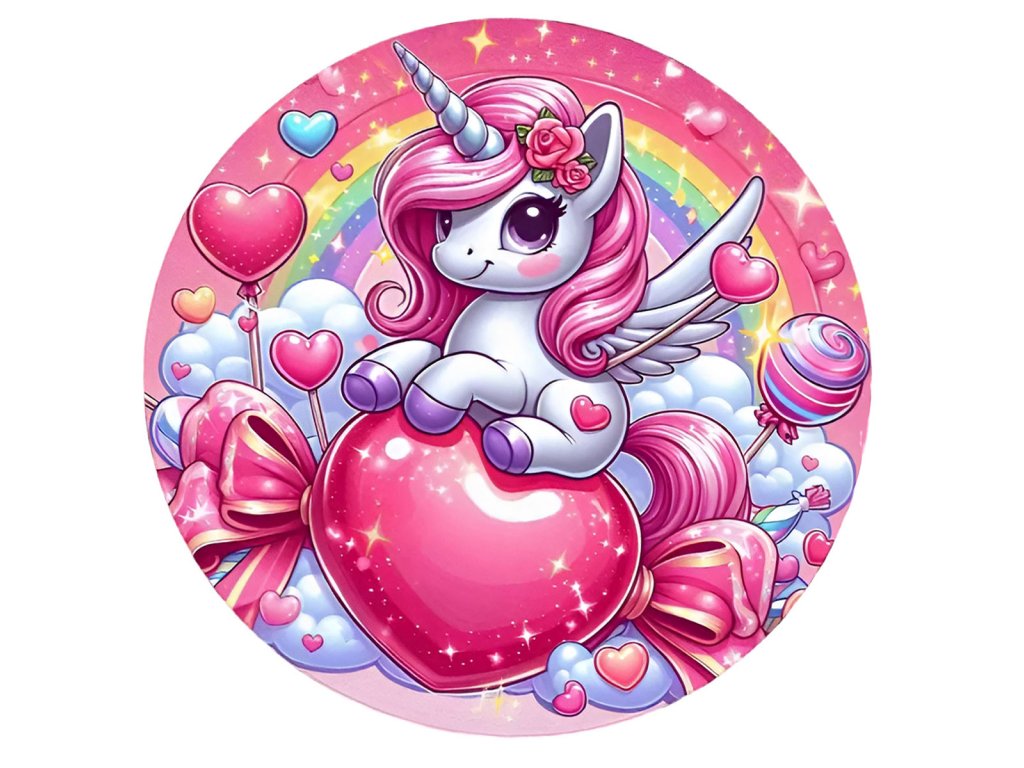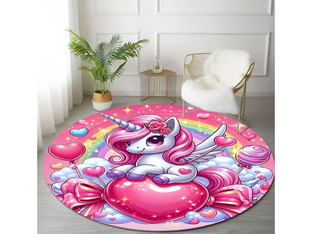 Kruhový koberec Unicorn ⌀120cm - Jednorožec a růžové srdce
