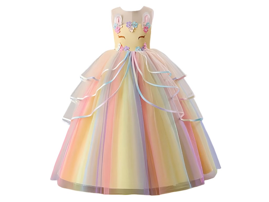 Pohádkové šaty v designu jednorožce s dlouhou duhovou sukní. Díky použitému materiálu se nemačkají, snadno se udržují, nežmolkují a jsou lehoučké. Hodí se karneval, narozeninovou oslavu, na focení nebo jen tak pro radost.