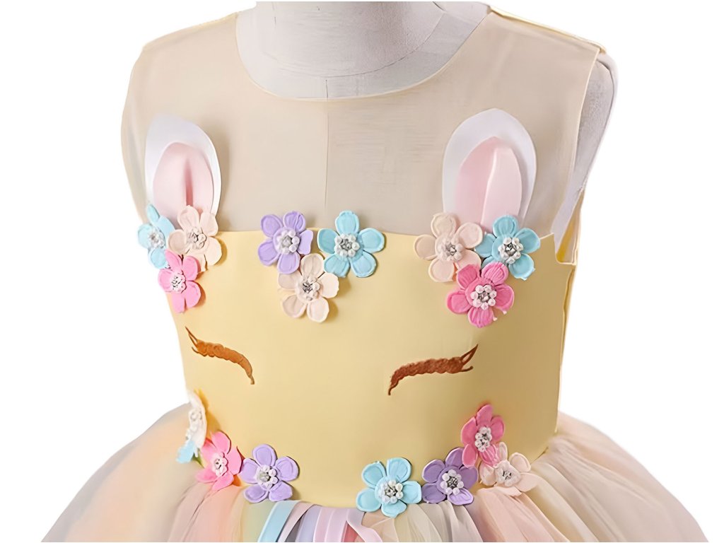 Pohádkové šaty v designu jednorožce s dlouhou duhovou sukní. Díky použitému materiálu se nemačkají, snadno se udržují, nežmolkují a jsou lehoučké. Hodí se karneval, narozeninovou oslavu, na focení nebo jen tak pro radost.