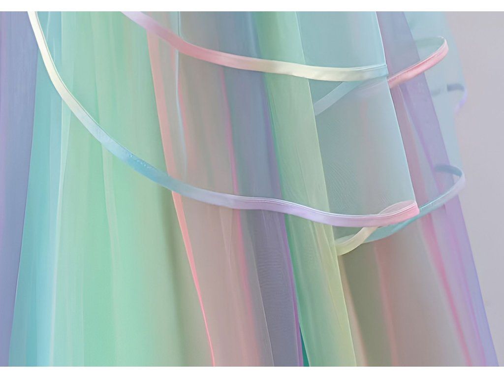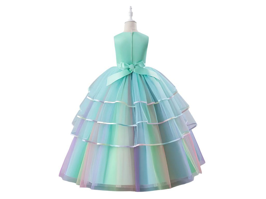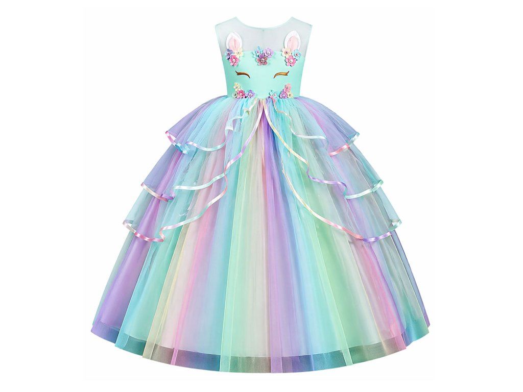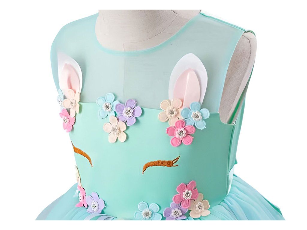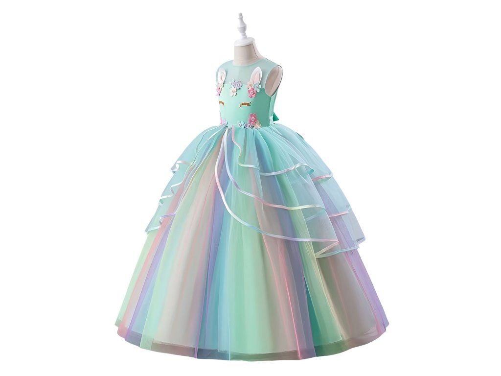 Pohádkové šaty v designu jednorožce s dlouhou duhovou sukní. Díky použitému materiálu se nemačkají, snadno se udržují, nežmolkují a jsou lehoučké. Hodí se karneval, narozeninovou oslavu, na focení nebo jen tak pro radost.