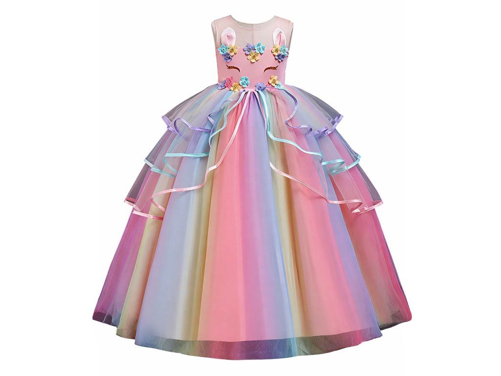 Pohádkové šaty v designu jednorožce s dlouhou duhovou sukní. Díky použitému materiálu se nemačkají, snadno se udržují, nežmolkují a jsou lehoučké. Hodí se karneval, narozeninovou oslavu, na focení nebo jen tak pro radost.