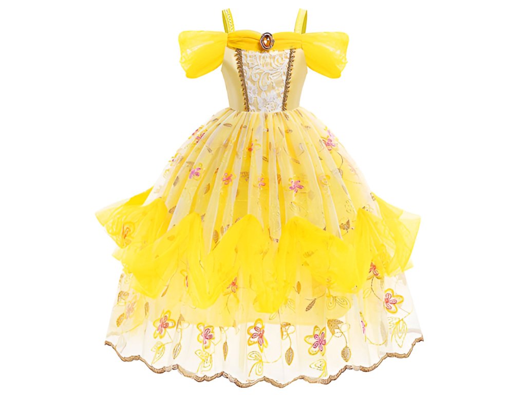 Dlouhé šatičky pro princeznu z pohádky Kráska a zvíře. Šaty jsou zdobené jemnou krajkou, mají nadýchanou sukni s drobnými květy a jsou na ramínka. Díky kvalitním materiálům se nemačkají, snadno se udržují, nežmolkují a jsou velmi lehké.