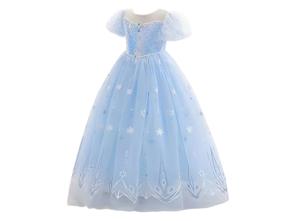 Karnevalový kostým s pohádkovým motivem Ledová princezna je určen pro všechny holčičky, které se rády předvádějí a převlékají. Staň se hvězdou karnevalového večírku díky tomuto kostýmu a ohrom všechny své kamarády. Šaty mají nabírané rukávy a bohatou sukničku. Součástí je také vlečka s vločkami.