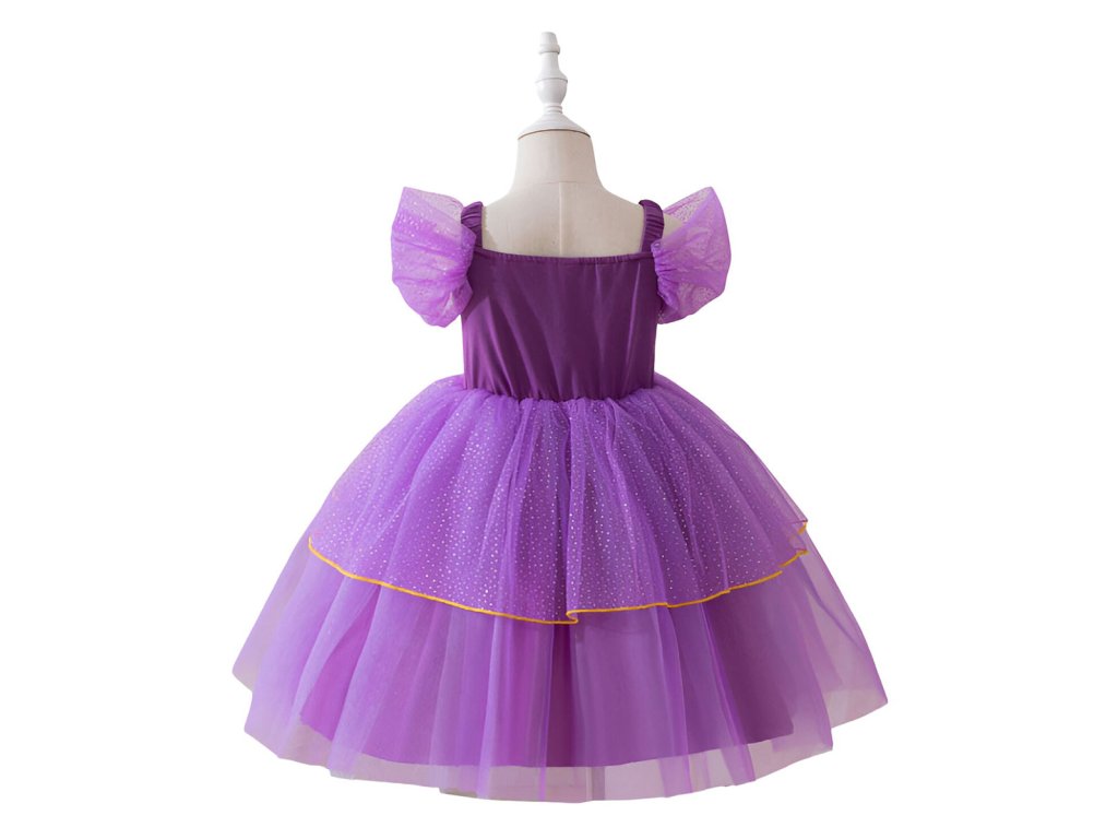 Pohádkové princeznovské šaty s nadýchanou sukní a zlatou výšivkou. Díky použitému materiálu se nemačkají, snadno se udržují, nežmolkují a jsou lehoučké. Hodí se karneval, narozeninovou oslavu, na focení nebo jen tak pro radost.