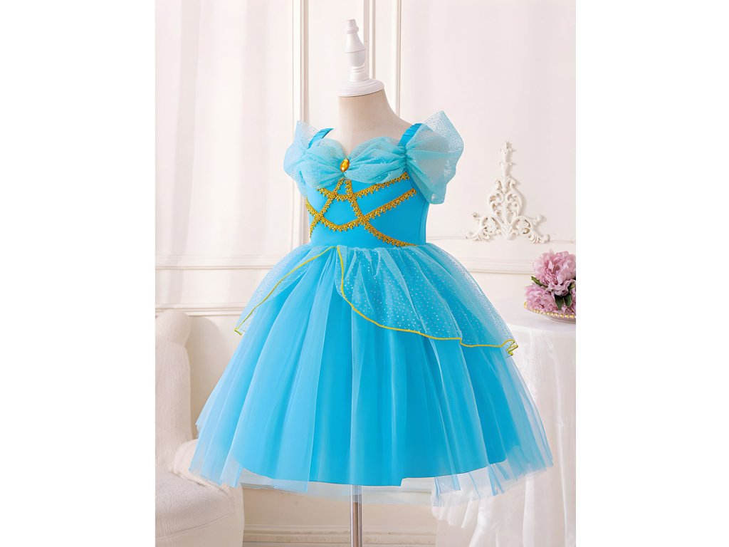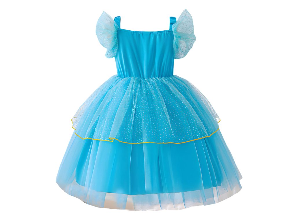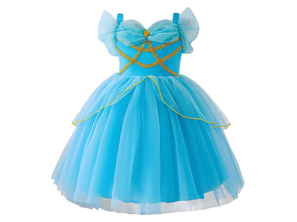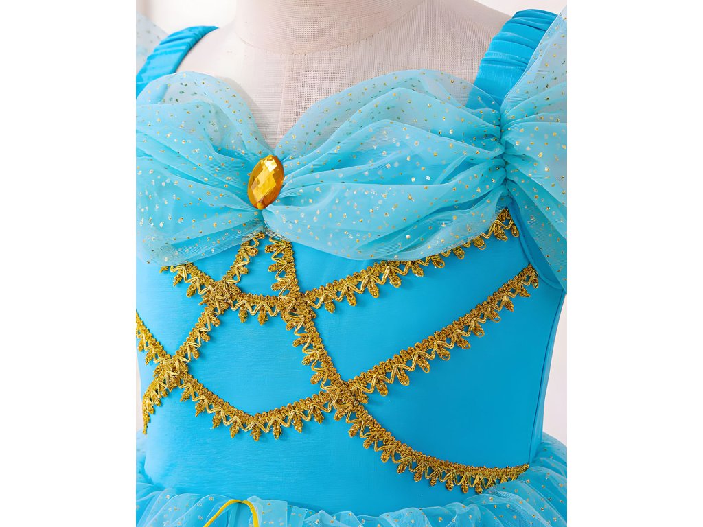 Pohádkové princeznovské šaty s nadýchanou sukní a zlatou výšivkou. Díky použitému materiálu se nemačkají, snadno se udržují, nežmolkují a jsou lehoučké. Hodí se karneval, narozeninovou oslavu, na focení nebo jen tak pro radost.