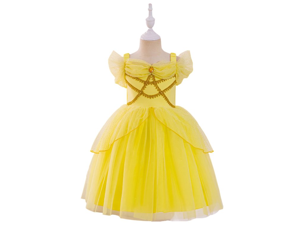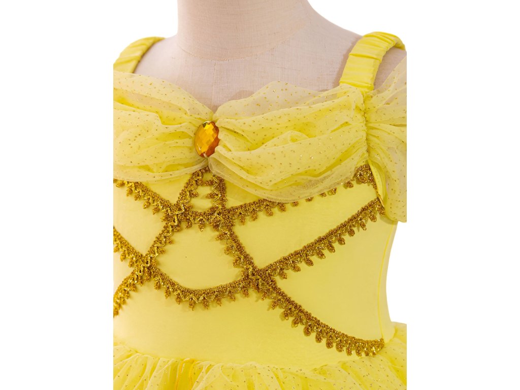 Pohádkové princeznovské šaty s nadýchanou sukní a zlatou výšivkou. Díky použitému materiálu se nemačkají, snadno se udržují, nežmolkují a jsou lehoučké. Hodí se karneval, narozeninovou oslavu, na focení nebo jen tak pro radost.
