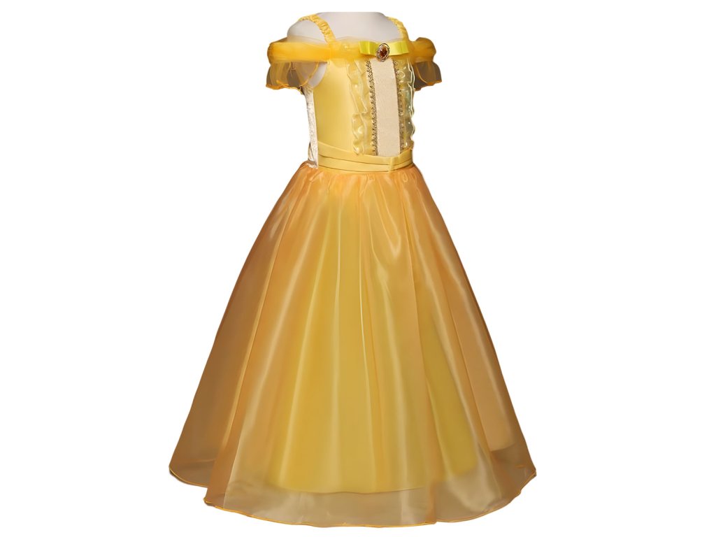 Nádherné šatičky pro princeznu z pohádky Kráska a zvíře. Šaty jsou dlouhé až na zem, mají "áčkový" střih a jsou na úzká ramínka. Díky kvalitním materiálům se nemačkají, snadno se udržují, nežmolkují, jsou velmi lehké, avšak krásně nadýchané.
