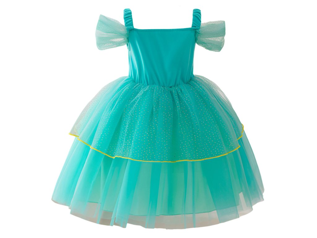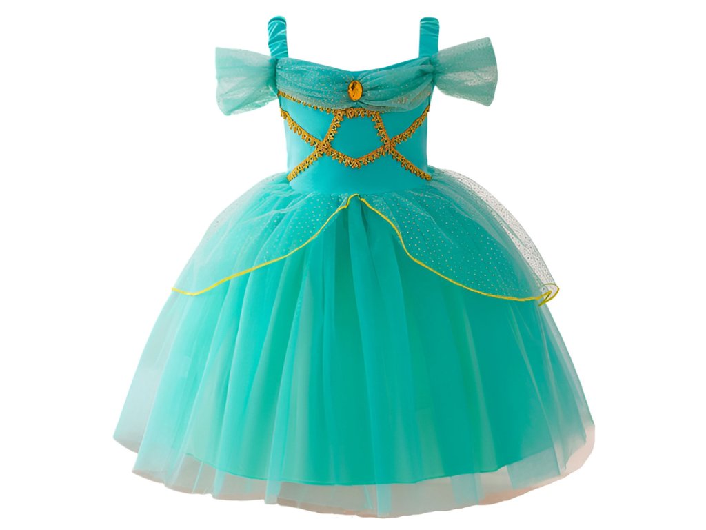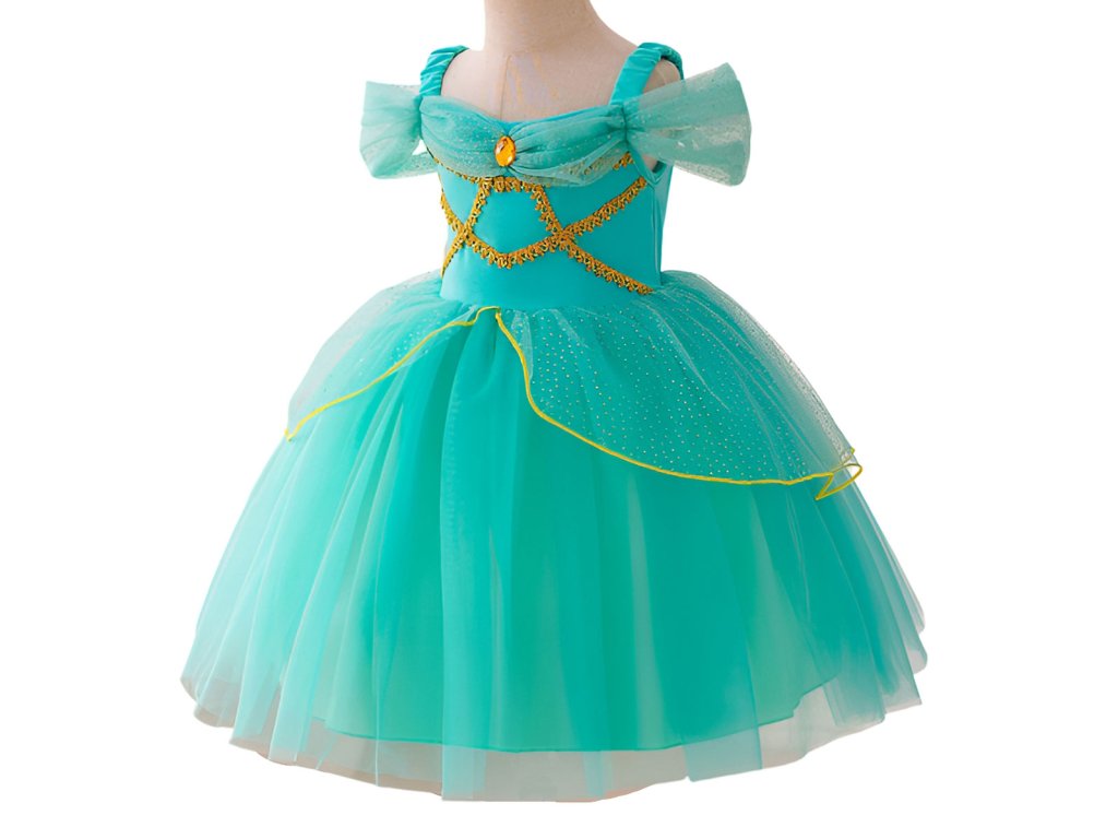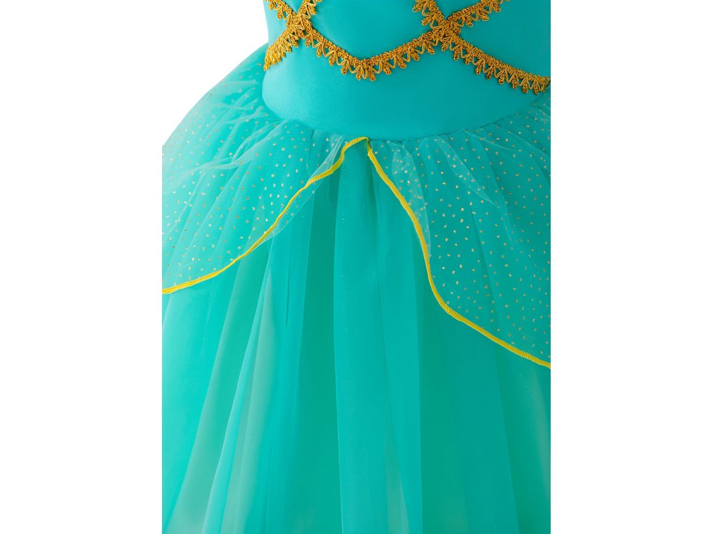 Pohádkové šaty princezny Jasmíny s nadýchanou sukní a zlatou výšivkou. Díky použitému materiálu se nemačkají, snadno se udržují, nežmolkují a jsou lehoučké. Hodí se karneval, narozeninovou oslavu, na focení nebo jen tak pro radost.