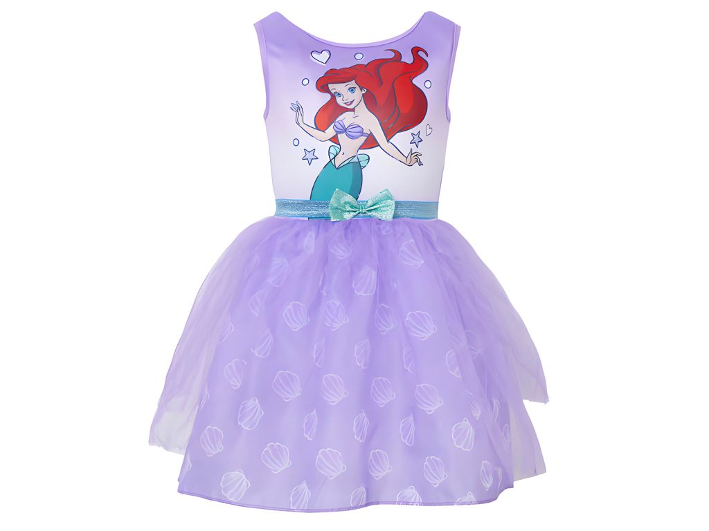 Pohádkové šaty s nadýchanou sukní a potiskem oblíbené mořské víly. Díky použitému materiálu se nemačkají, snadno se udržují, nežmolkují a jsou lehoučké. Hodí se karneval, narozeninovou oslavu, na focení nebo jen tak pro radost.