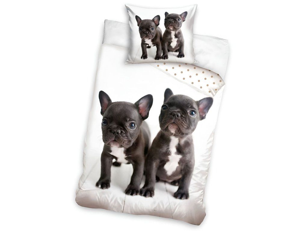 Bavlněná ložní souprava s motivem Buldočků. Povlečení je mimořádně příjemné na dotek a má pohodlné zapínání na zip. Výrobek je certifikován a testován na 100 zdravotně významných parametrů a má pozitivní výsledek doložený certifikátem OEKO-TEX® Standard 100, který potvrzuje, že splňuje všechny hygienické požadavky pro použití u dětí.