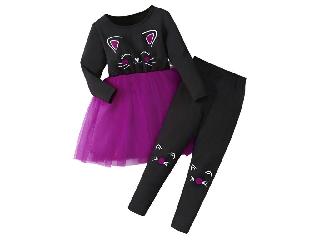 Elegantní šaty s bohatou sukní, obrázkem kočičky a legíny ve stejném designu, aby vaše malá princezna vypadala stylově. Souprava je vhodná na běžné nošení, focení, do školky nebo na různé maškarní příležitosti a karnevaly.