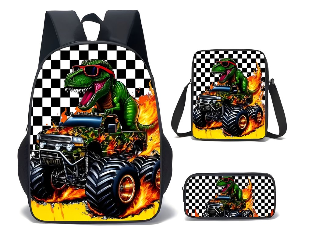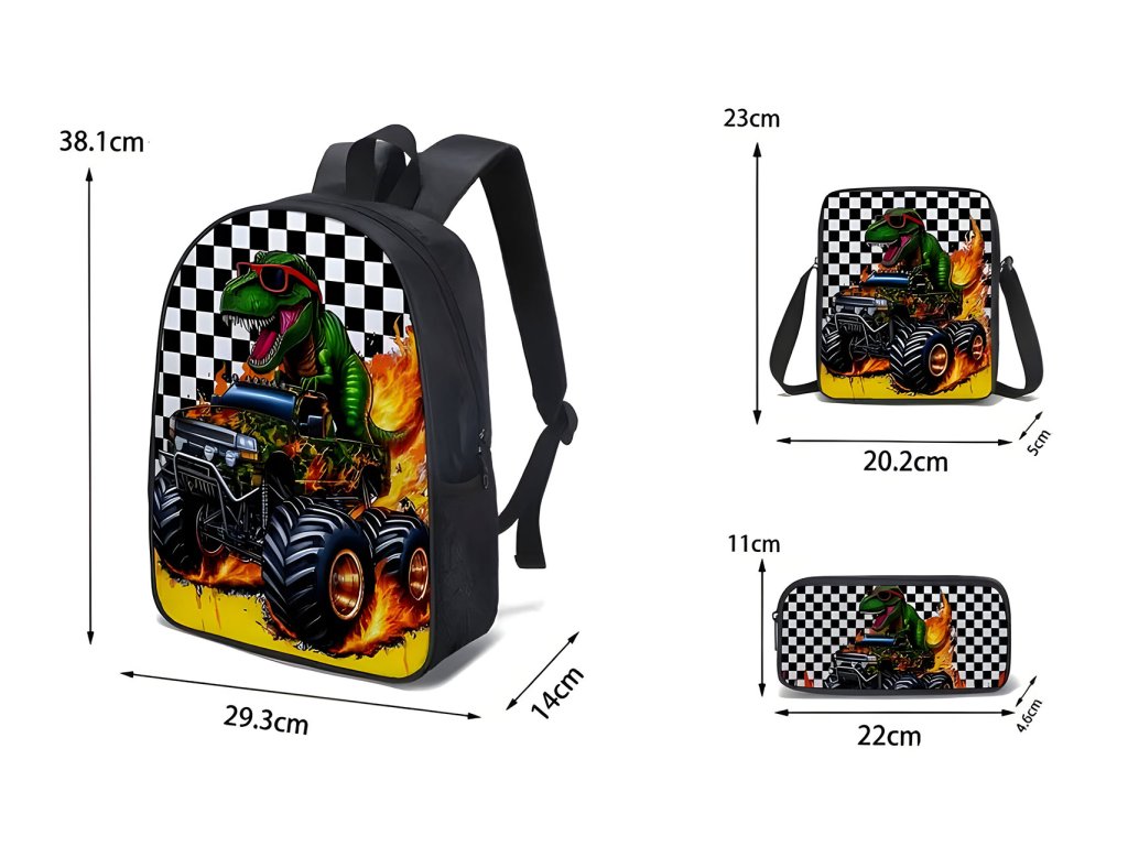 Školní sada 3ks šachovnice - Batoh, penál, crossbody taška - Zelený dinosaurus