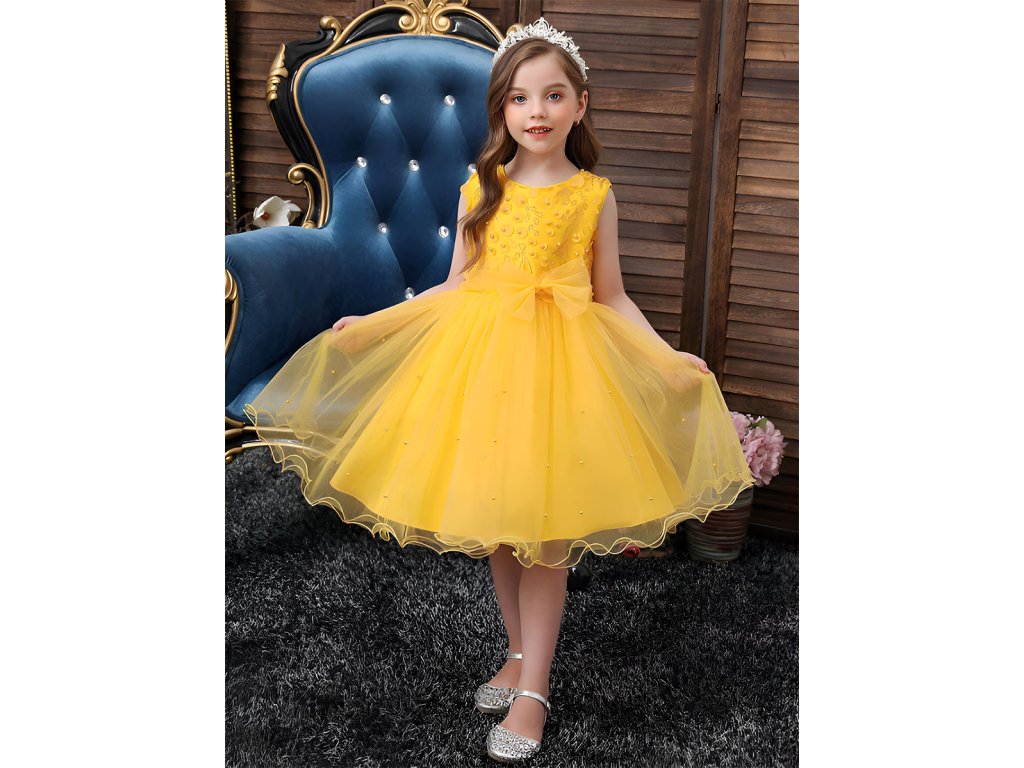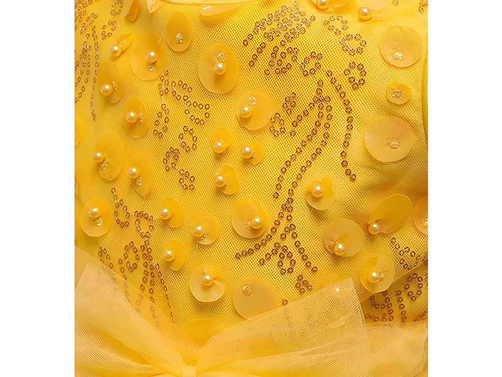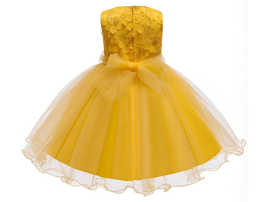 Žluté společenské šaty s bohatou nadýchanou sukní. Zdobené jsou drobnou výšivkou, flitry a perličkami. Jsou vhodné na jakoukoliv slavnostní příležitost, na karneval, narozeninovou oslavu nebo oblíbené dětské párty. Tyto společenské šaty jsou více než jen o módním projevu - jsou o vytváření nezapomenutelných okamžiků plných radosti a půvabu. Dejte možnost vaší malé slečně zazářit na každé slavnostní události v těchto nádherných šatech, které zdůrazní její jedinečný půvab.