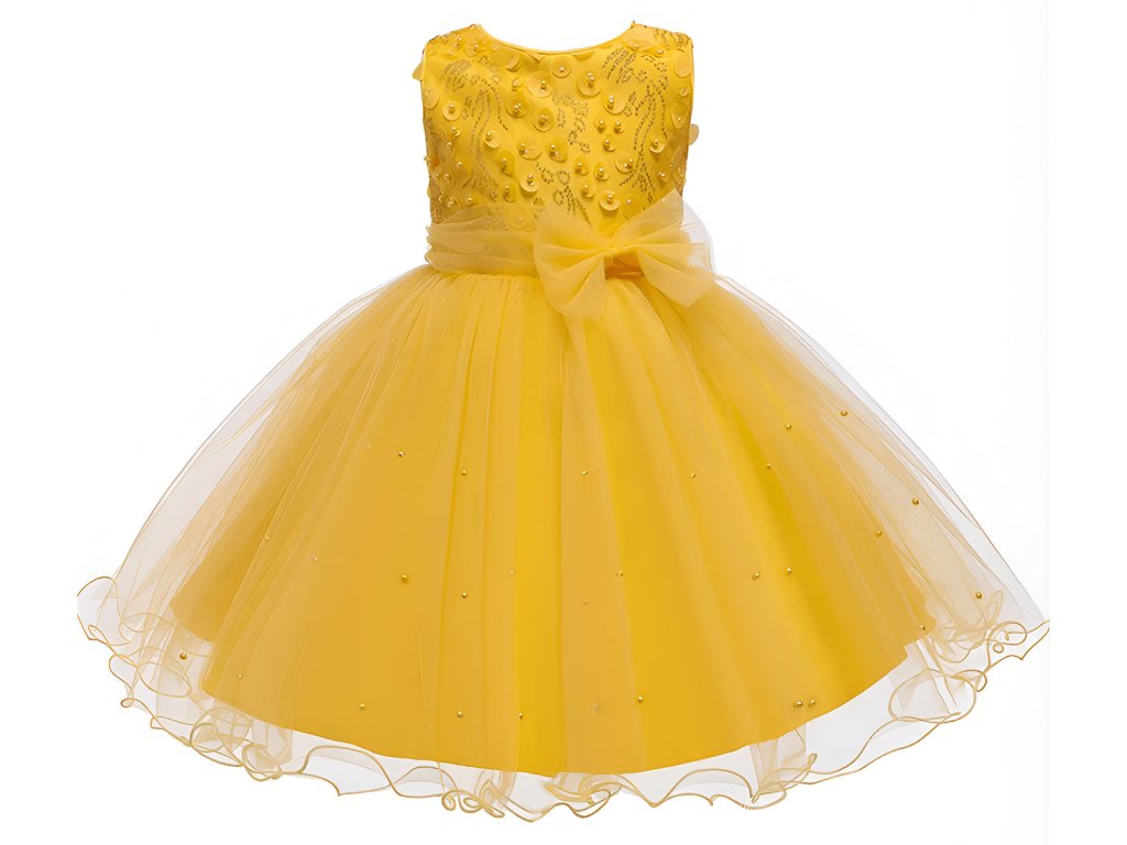 Žluté společenské šaty s bohatou nadýchanou sukní. Zdobené jsou drobnou výšivkou, flitry a perličkami. Jsou vhodné na jakoukoliv slavnostní příležitost, na karneval, narozeninovou oslavu nebo oblíbené dětské párty. Tyto společenské šaty jsou více než jen o módním projevu - jsou o vytváření nezapomenutelných okamžiků plných radosti a půvabu. Dejte možnost vaší malé slečně zazářit na každé slavnostní události v těchto nádherných šatech, které zdůrazní její jedinečný půvab.