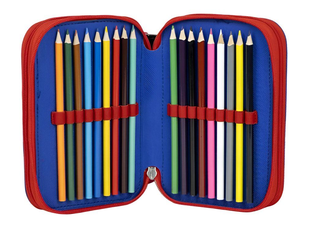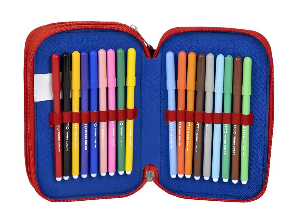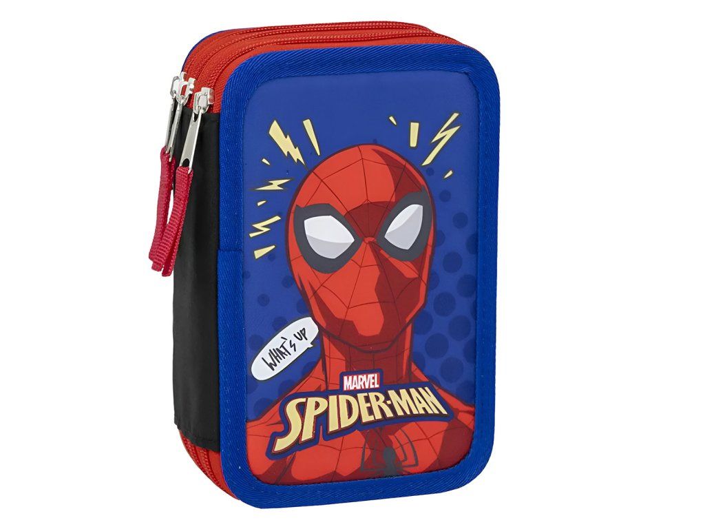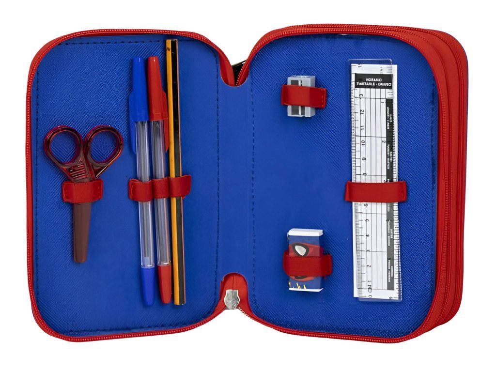 Licencovaný školní penál Spiderman jistě potěší každého malého školáčka, který má rád superhrdiny. Penál má tři patra a obsahuje fixy, pastelky, tužky, gumu, pravítko, ořezávátko, bloček a kapsu na rozvrh. Obsahem penálu jsou kvalitní tužky a fixy italské firmy GIOTTO.