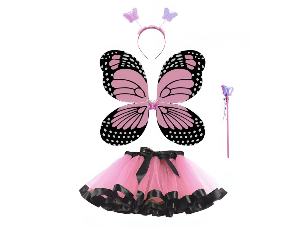 Motýlí křídla a sukně jsou dokonalým doplňkem pro vaši malou princeznu, která sní o kouzelném světě pohádkových bytostí. Kontrastní prvky dodávají křídlům nádech magie a okouzlení, které vaše dítě určitě ocení. Sukně má elegantní střih a je lemována černými detaily, které jistě upoutají pozornost. Tyto doplňky jsou ideální volbou pro kostýmovou párty, divadelní vystoupení nebo jen pro hravé chvíle doma. Křídla jsou vyrobeny s ohledem na detaily a bezpečnost dětí. Celá sada je doplněna hůlkou a čelenkou.