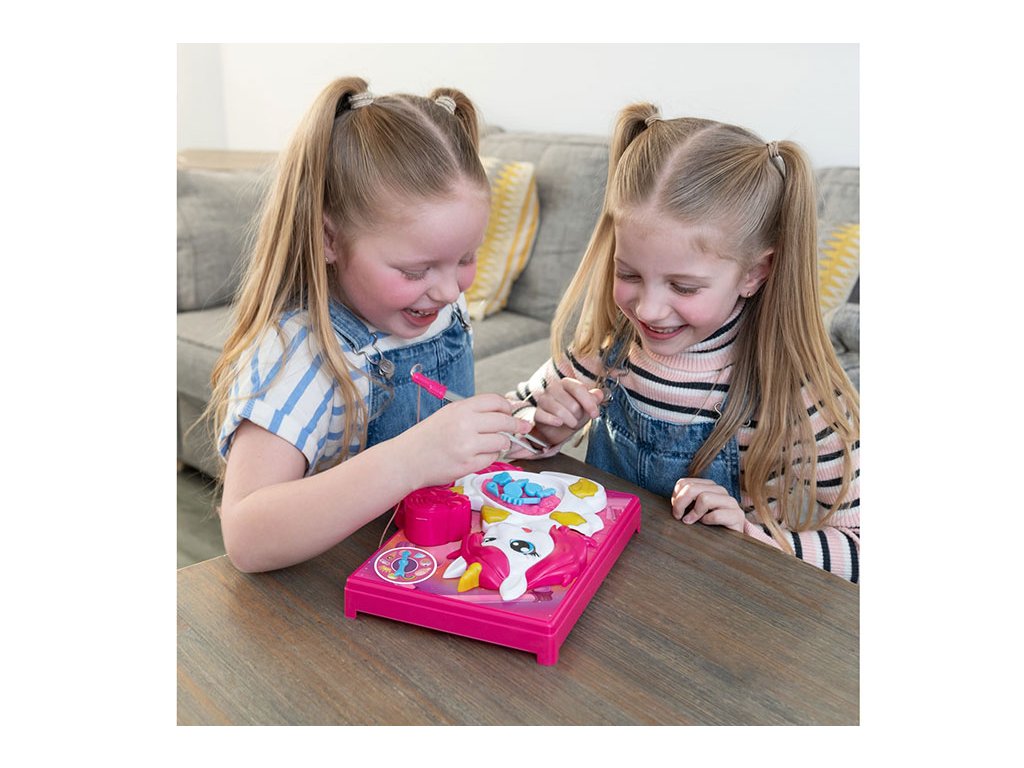 Balení obsahuje: Operační stůl pro jednorožce, 10x části těla, 1x pinzetu, 1x spinner a vajíčko na skladování slizkých části těla.